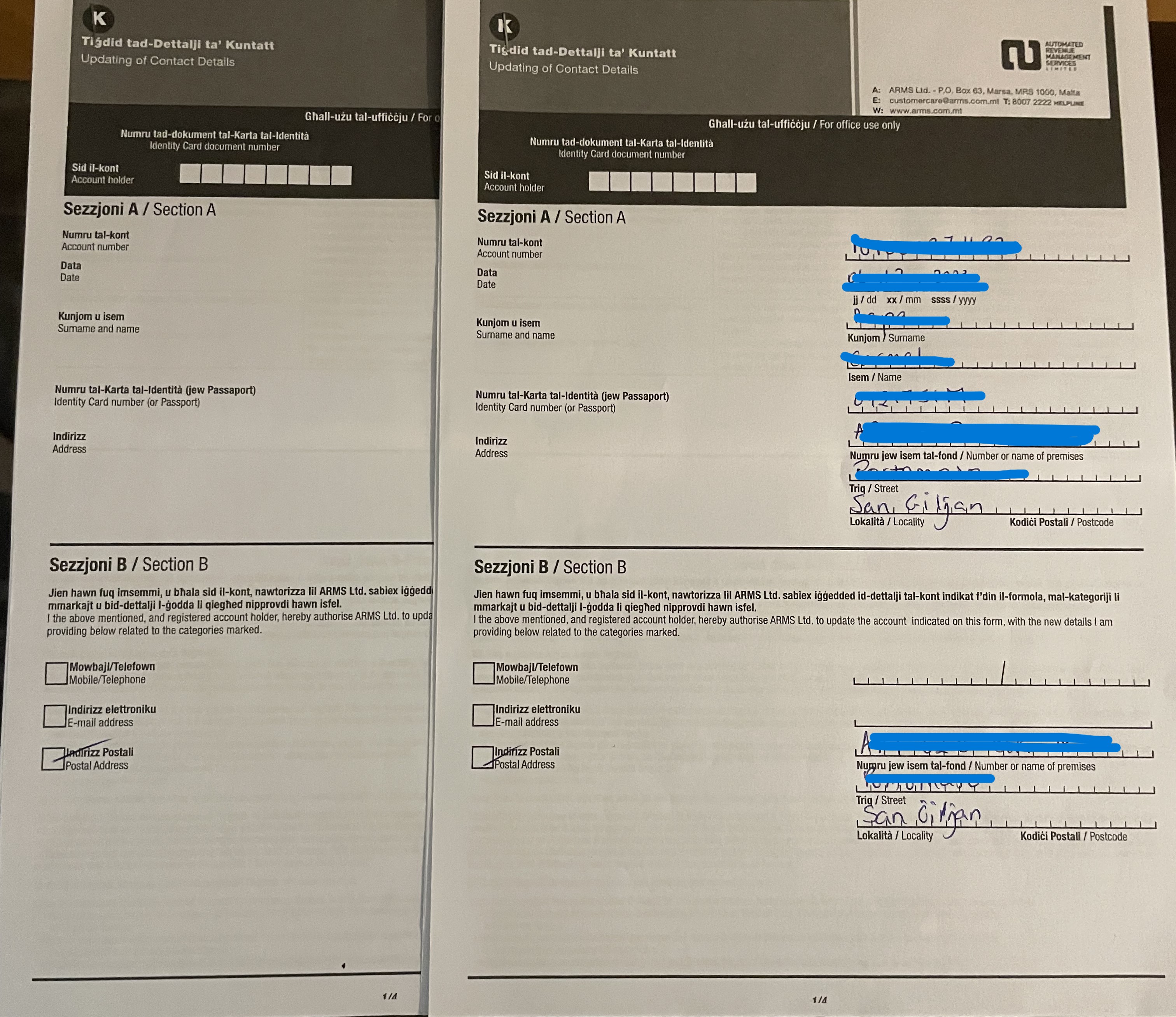 P.O. Box 63, Marsa MRS1000), or take it in to an ARMS Customer Service Centre.