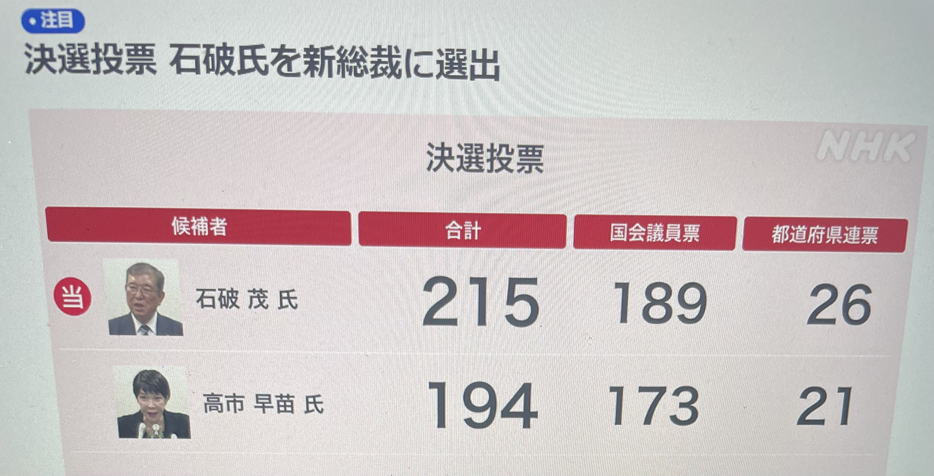 石破氏が1回目で1位になった高市氏を逆転し、