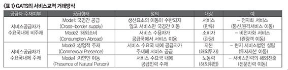WTO의 GATS는 서비스무역의 거래 방식을 4가지 형태(mode)로 구분했다.