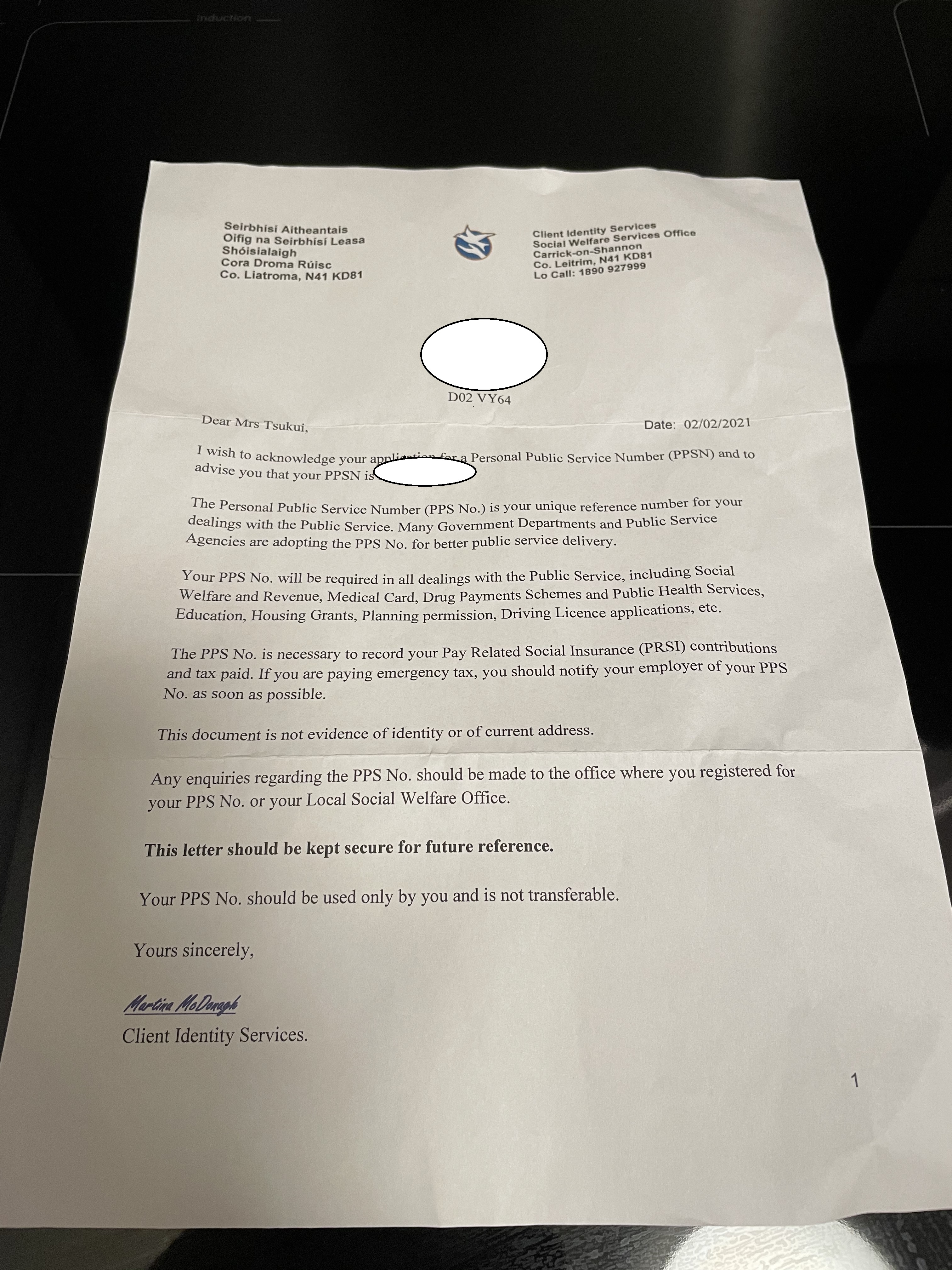 家にはPPSN番号が届きました。