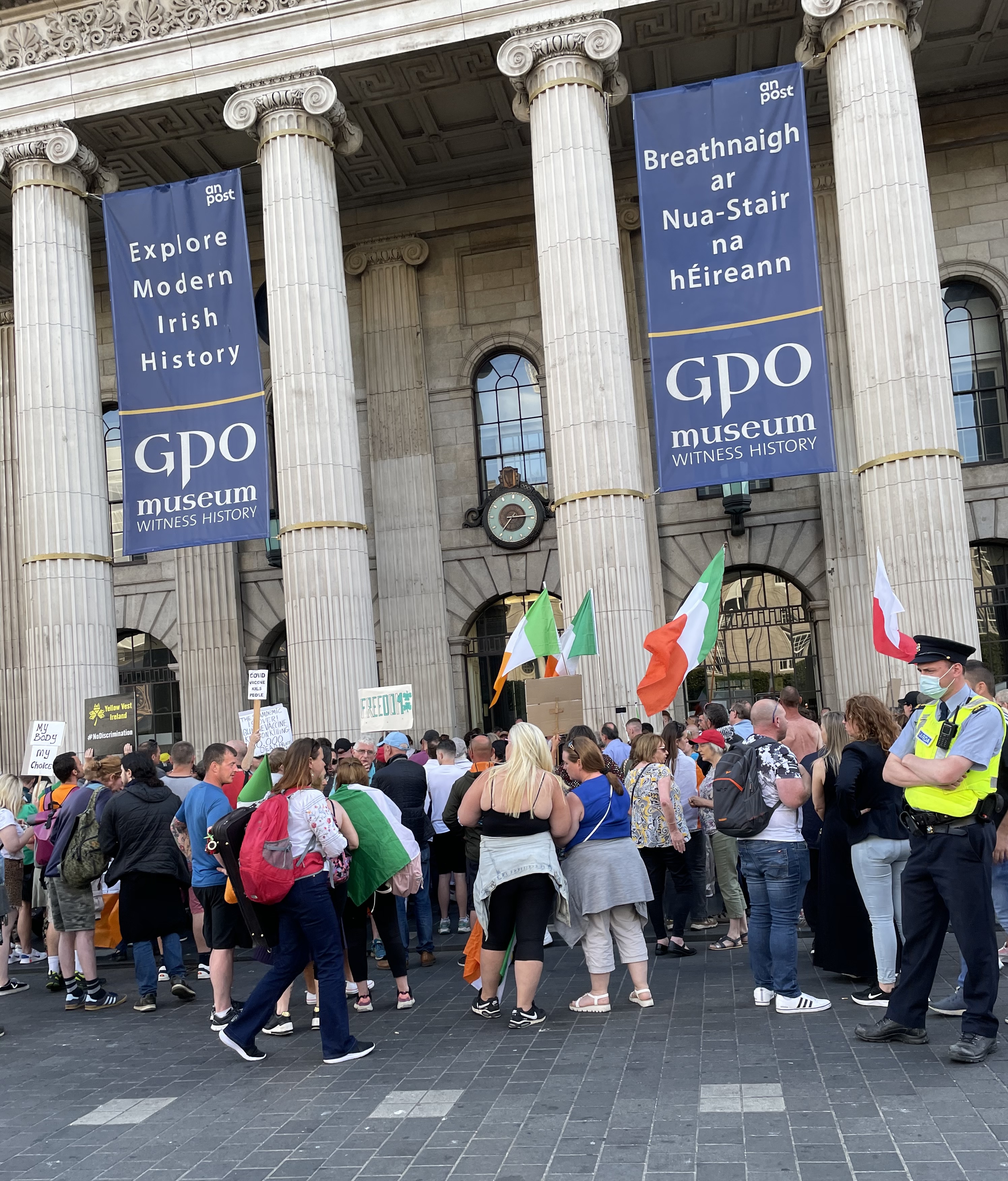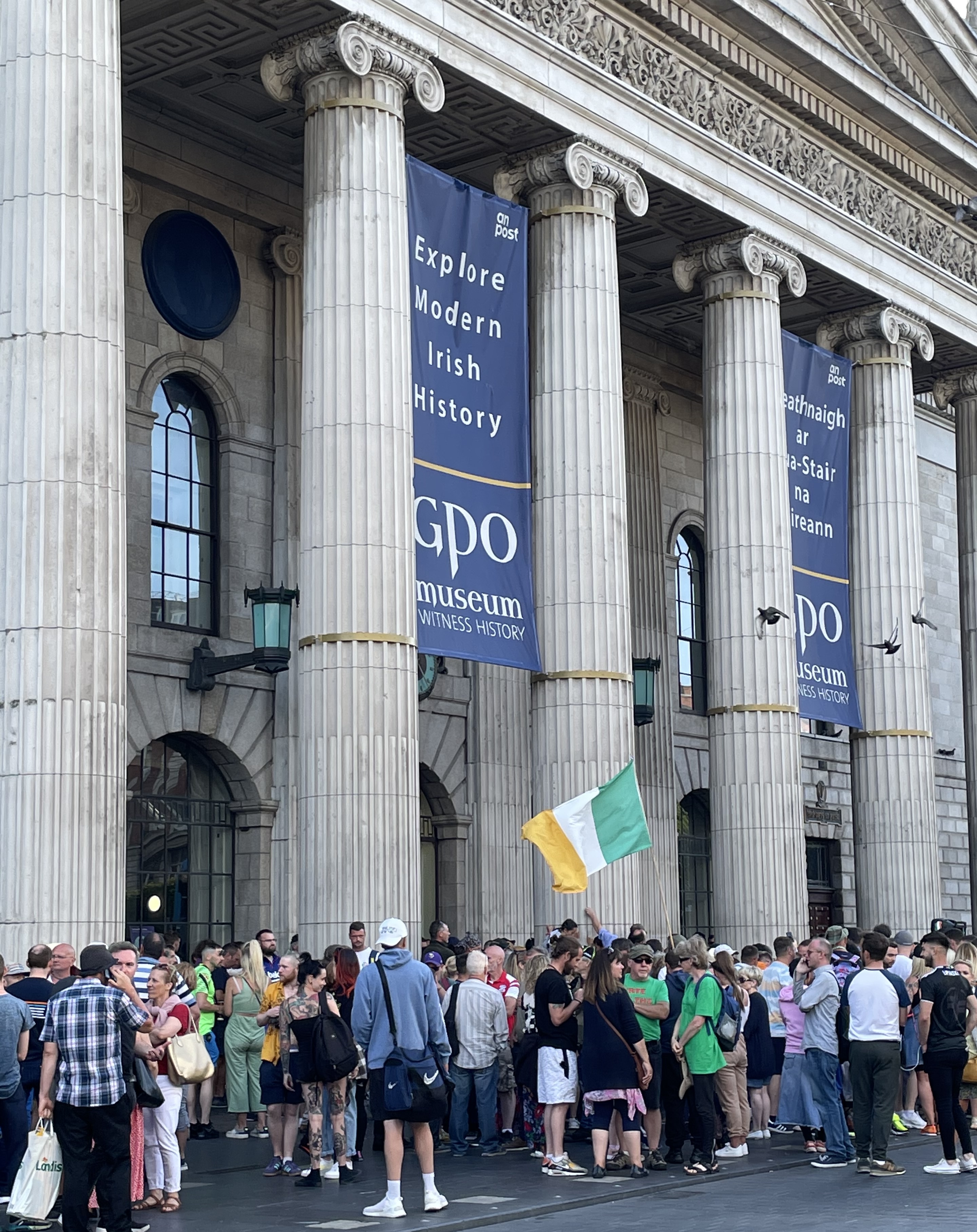 플래카드를 들고 다른 일부는 아일랜드 국기와 아일랜드 군 깃발을 흔들었다.