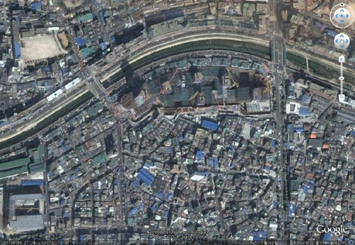 | ▲2008년 8월 현재 구글어스로 내려다본 황학동 롯데캐슬 전경. 공사가 한창 진행 중이고 신축아파트 앞의 삼일아파트 상가도 철거되지 않은 것을 봐서 2007년 이전의 데이터가 아직 업데이트되지 않은 것으로 추정된다 © 구글어스 캡쳐처화면 |