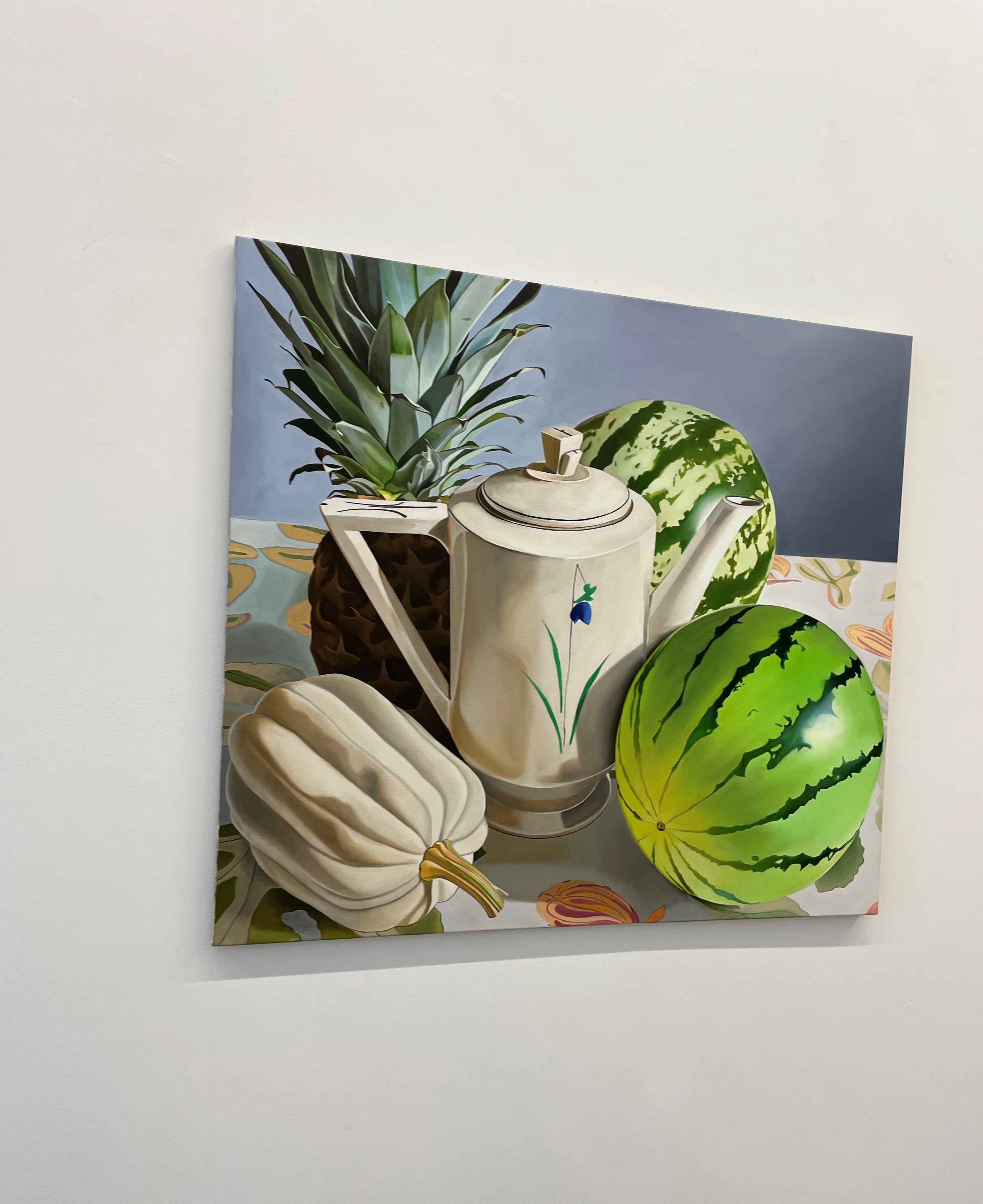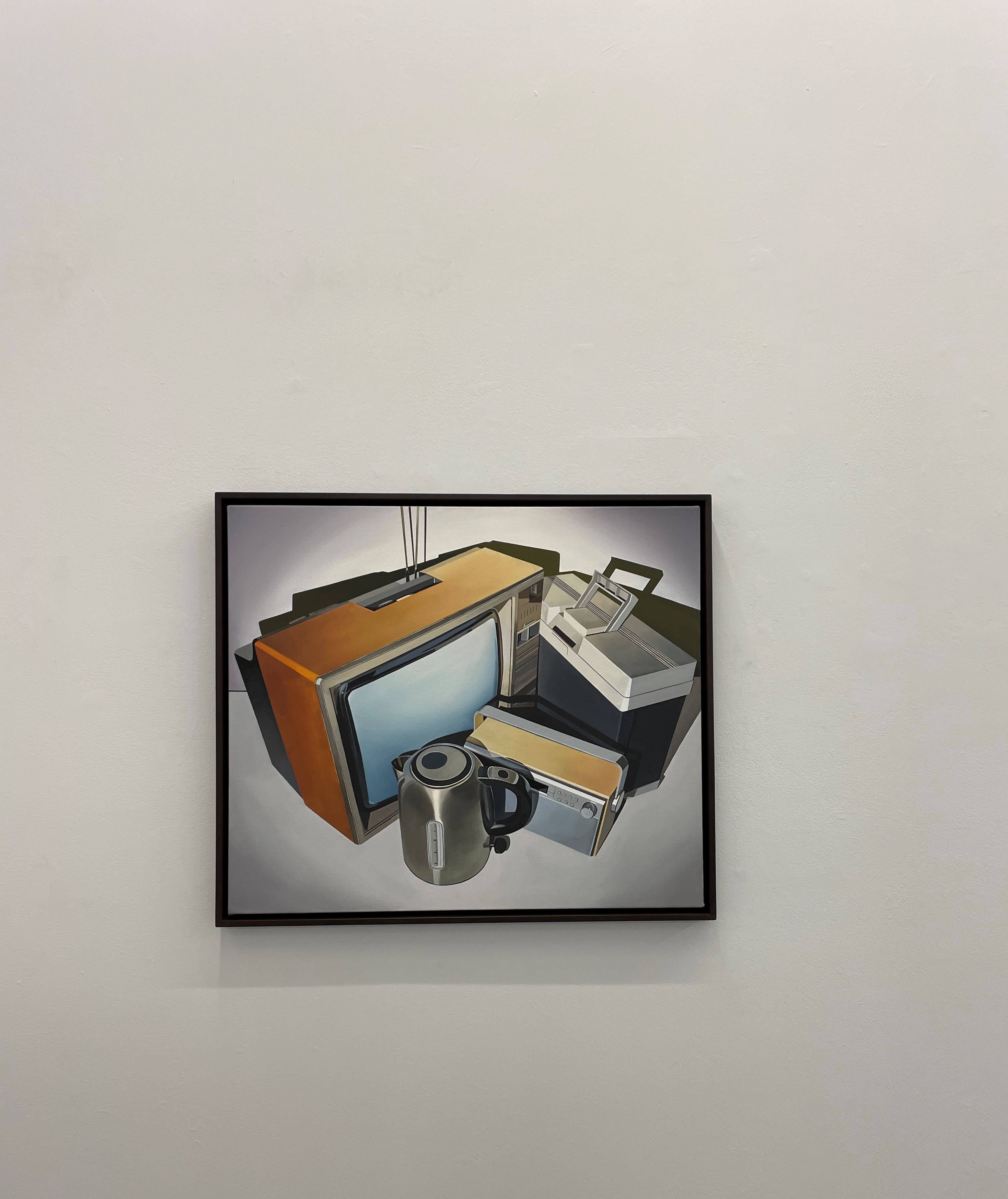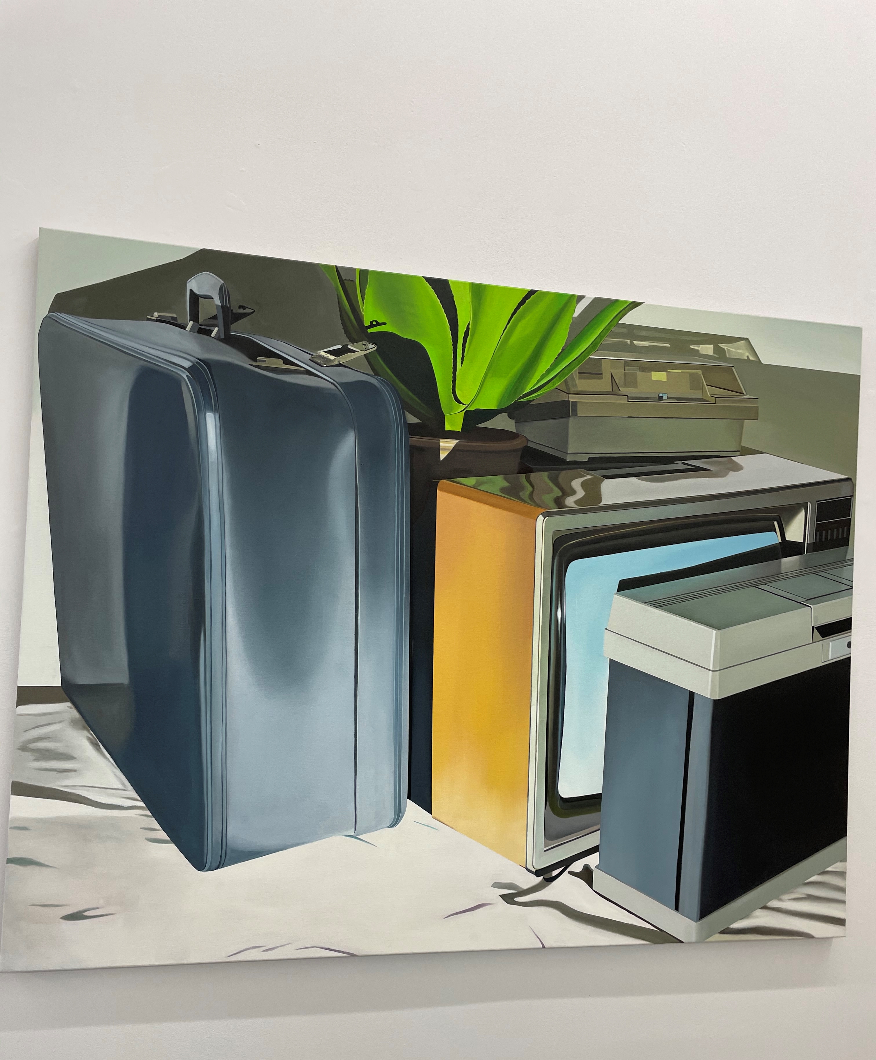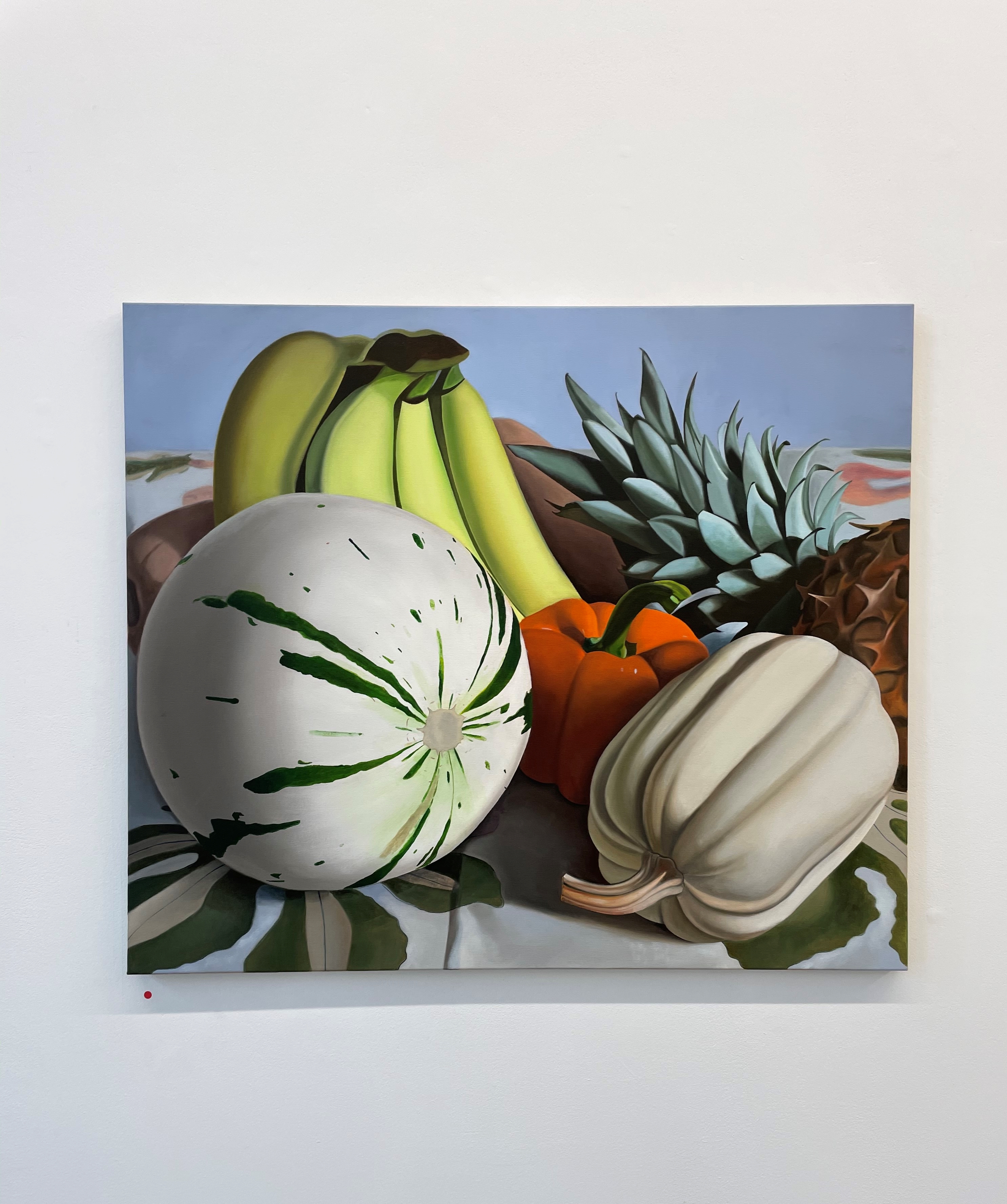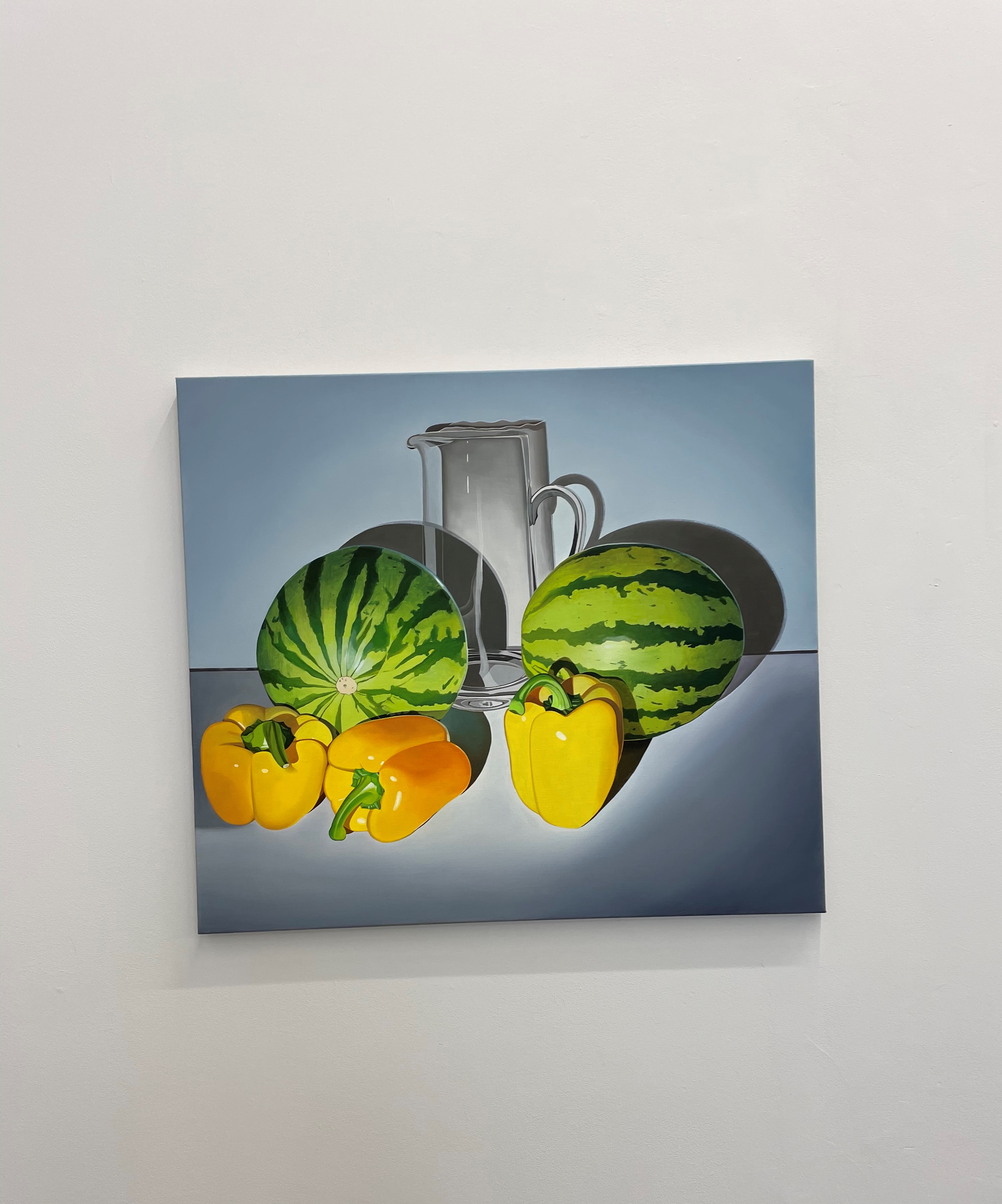 a fake plant, yellow peppers: an array of quotidian items share the canvas