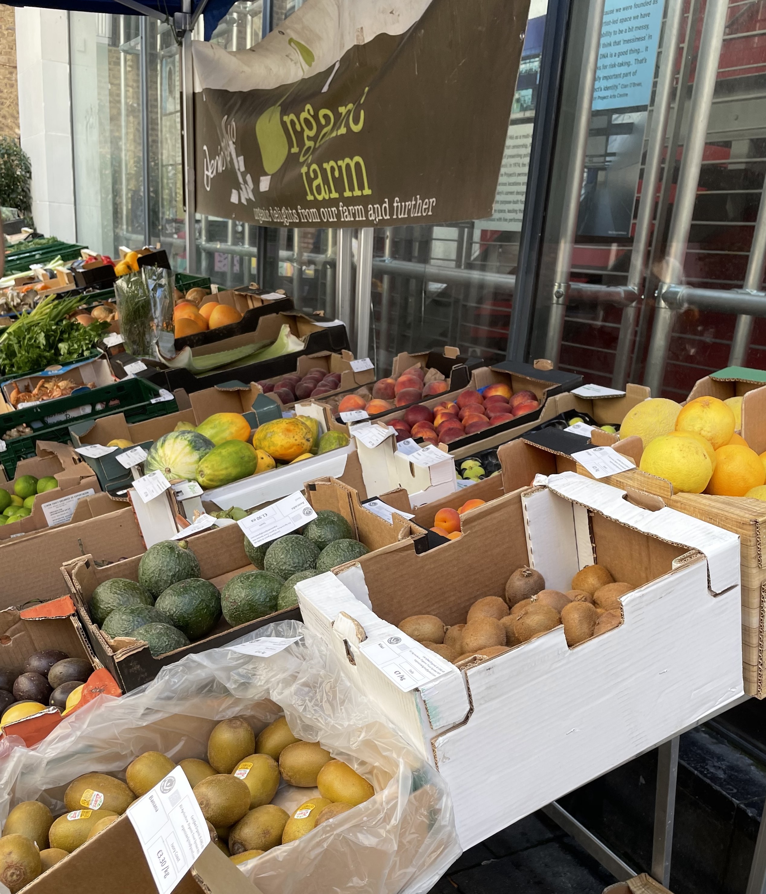 The weekend market is filled with vegetables, fruits and bread.